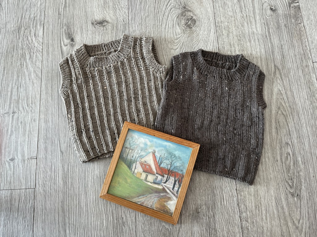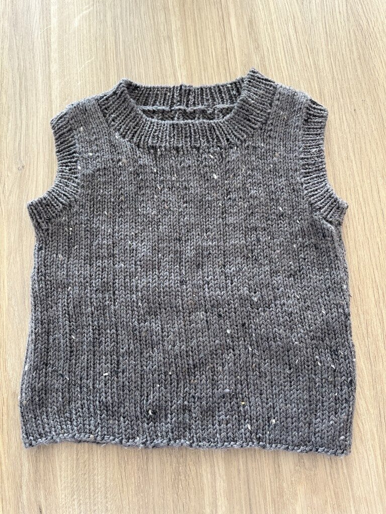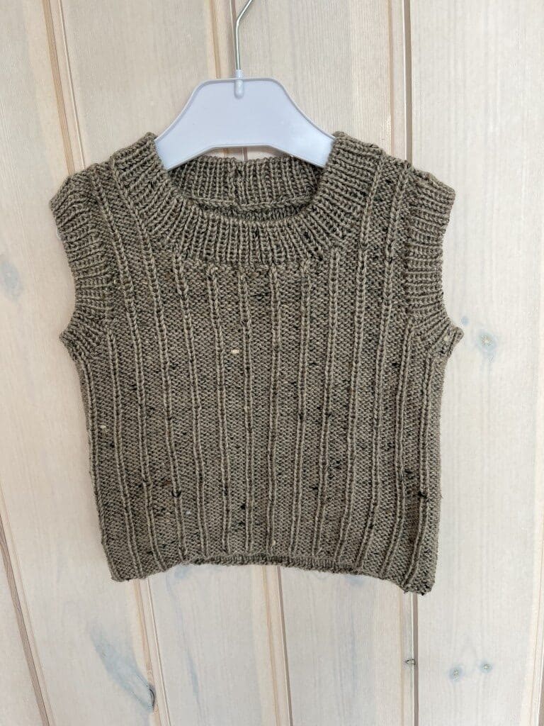 In this pattern, you get a vest in size 0-5 years. The vest is knitted in the delicious Mayflower “Easy Care – tweed” needle on 3.5 mm needles Super nice yarn for both children and adults – and the tweed version just gives that little spice, if you ask me. Super nice yarn, which is also available without “tweed”. (Be careful when buying yarn. It is also available in an “Easy Care Classic, which is for 4mm needles – just so you don’t make a mistake and buy the wrong one).